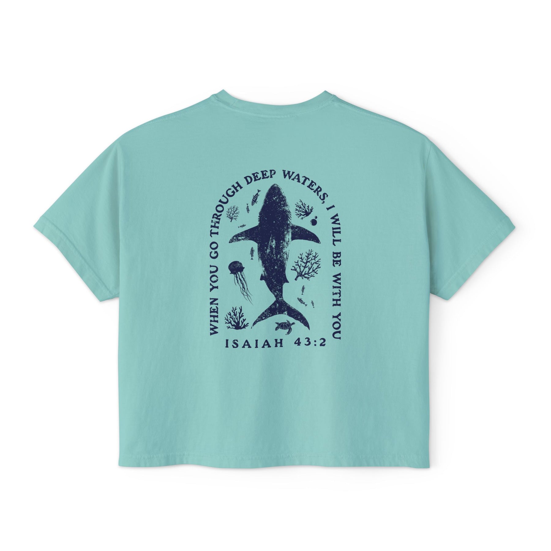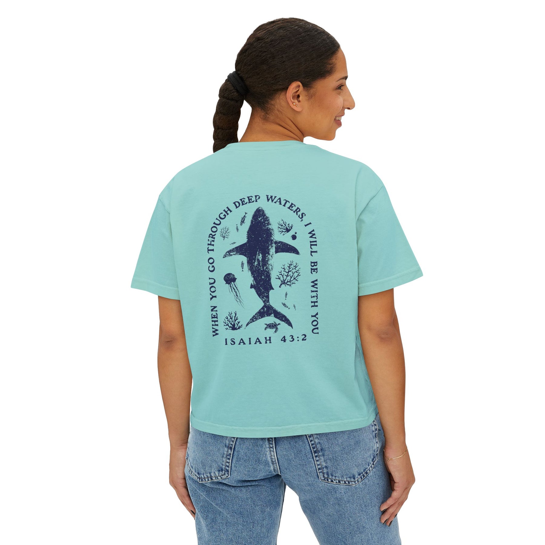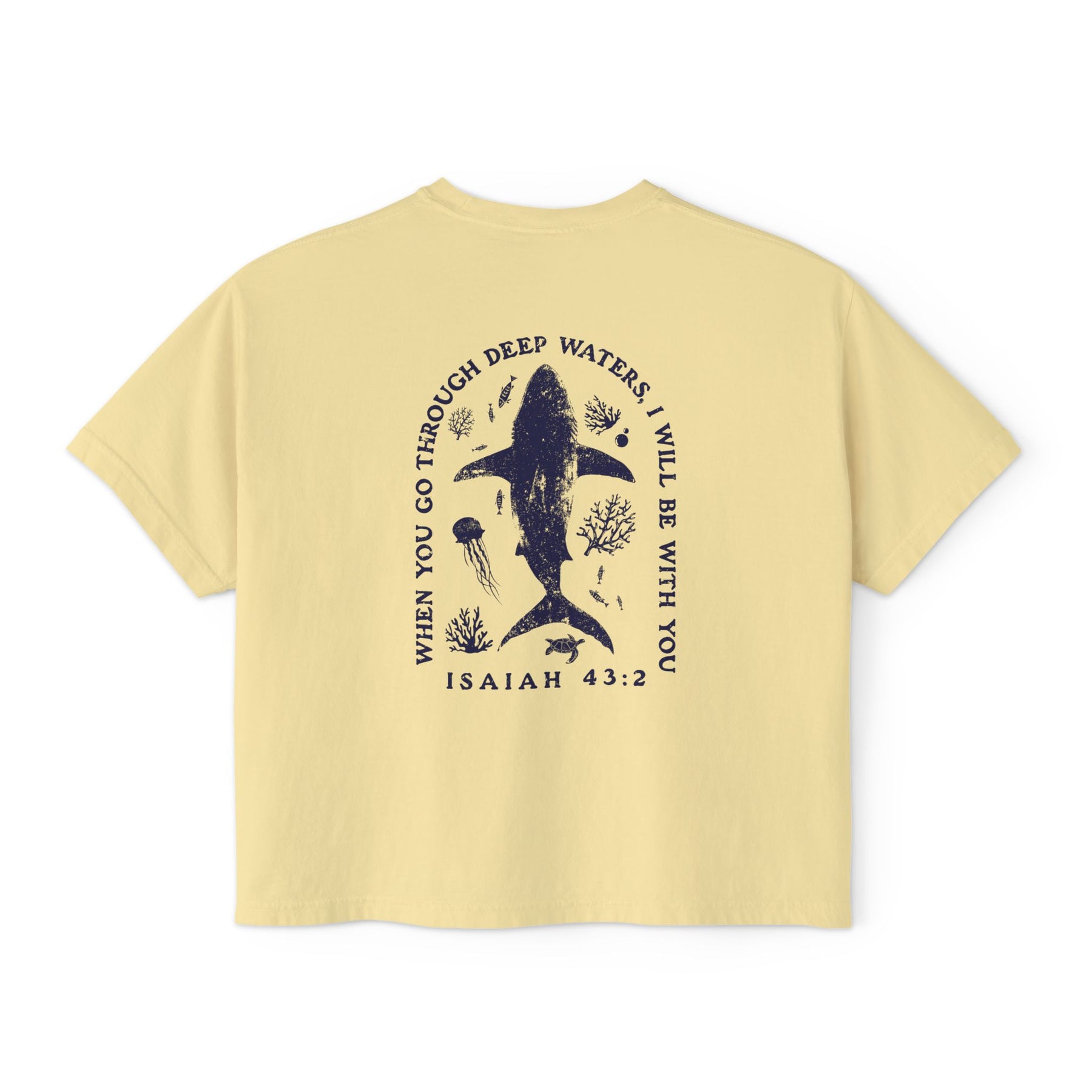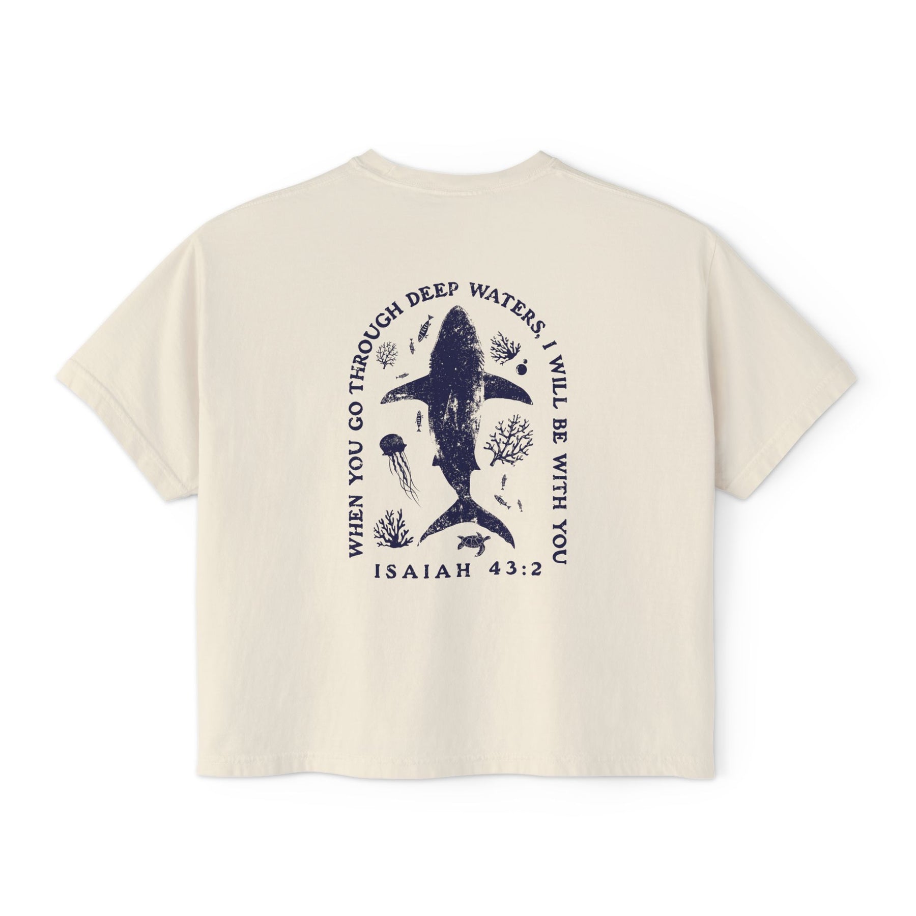 This boxy tee brings quiet comfort and thoughtful meaning to everyday wear. Cut in a slightly cropped, boxy silhouette from heavy ring-spun US cotton, it feels substantial yet lived-in thanks to pigment dye coloring that gives each piece a subtle vintage character. The front carries a small, simple emblem while the back features a poetic, nature-inspired illustration and the comforting line from Isaiah 43:2 — a reminder of steady presence in deep waters. Short sleeves and shoulder-to-shoulder twill tape keep the shape grounded. Wear it layered over leggings for slow mornings, with high-waisted jeans for a seaside wander, or as a soft statement on days you want a calm, grounded look.